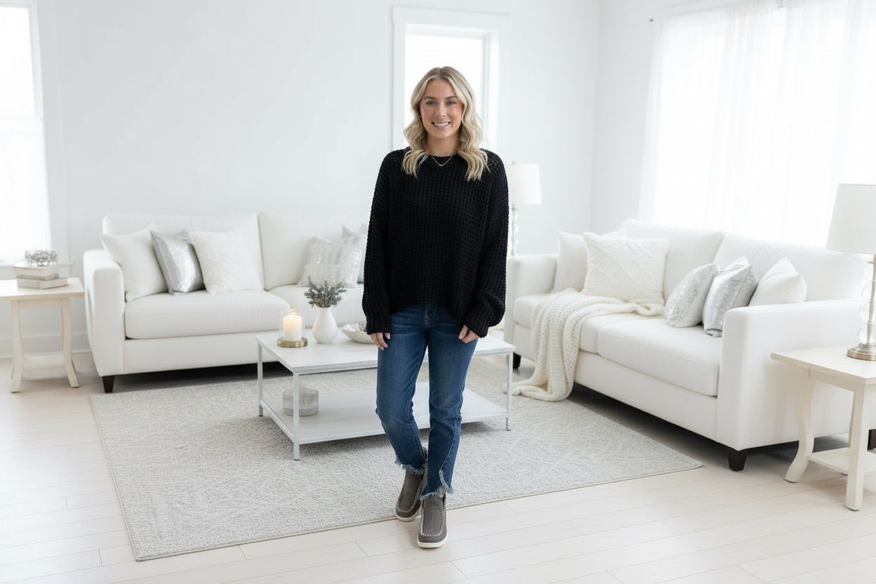The Black Sheer Knit Sweater is crafted from 100% acrylic, offering a lightweight and breathable option for layering. Its sheer design facilitates airflow, making it suitable for transitional weather. The material is durable and easy to care for, ensuring long-lasting wear while maintaining its shape and appearance.